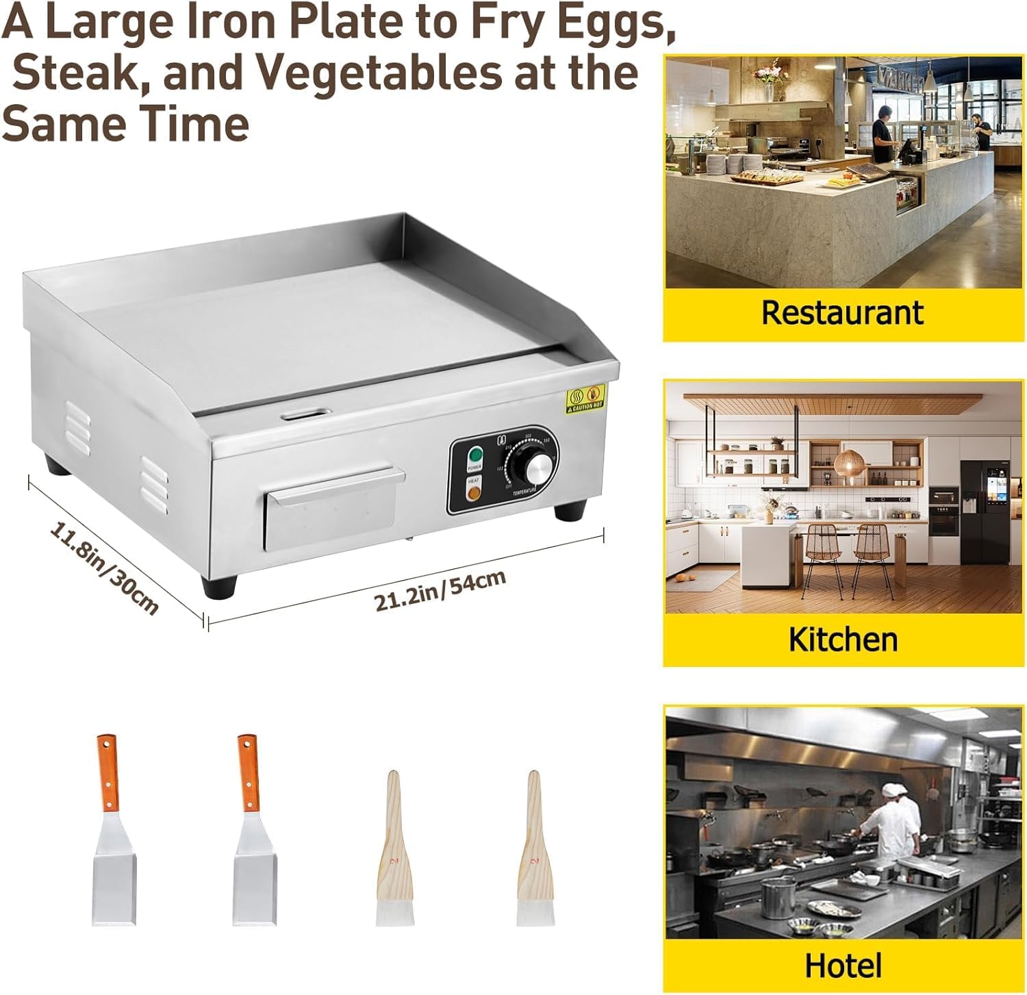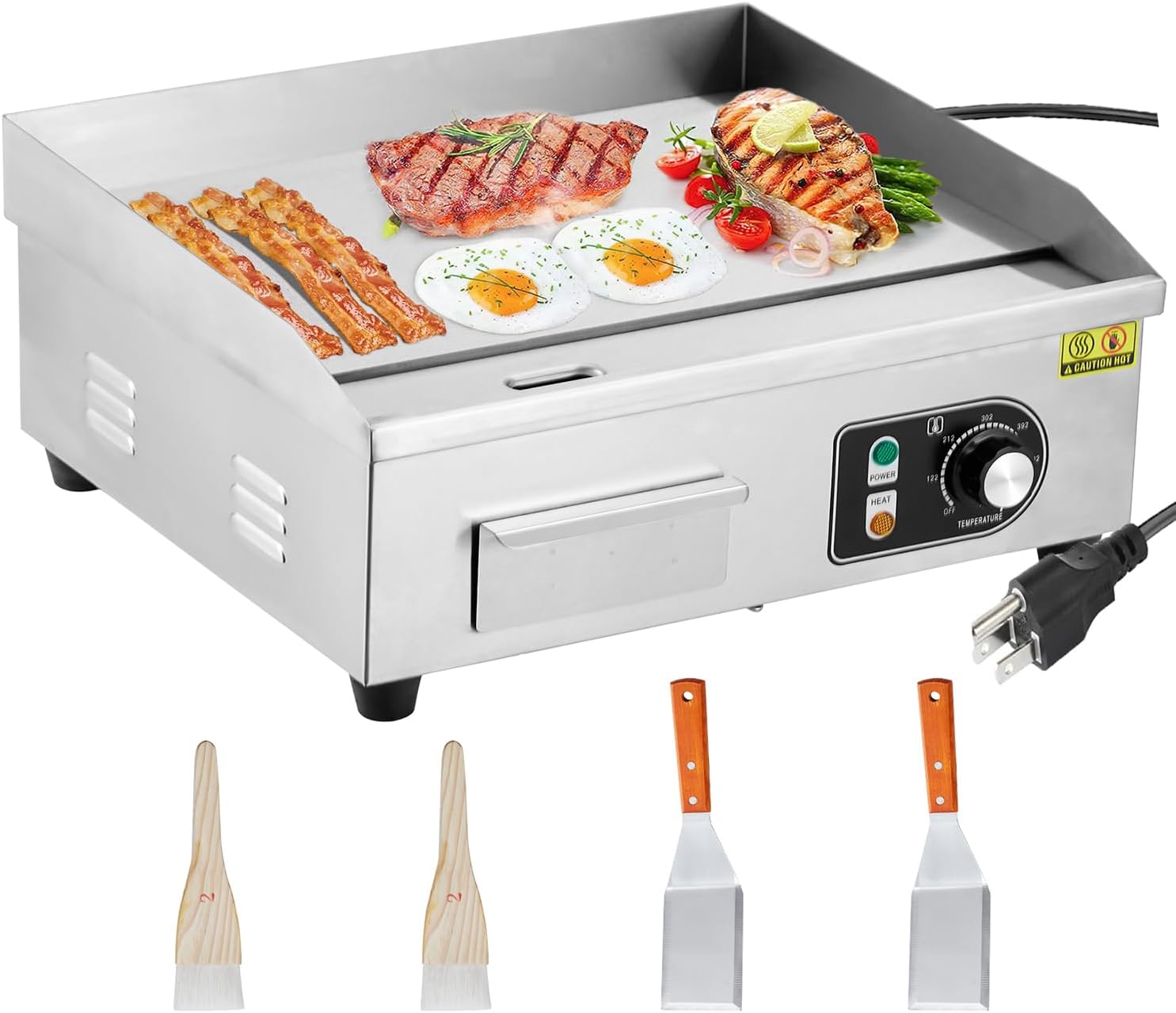 Upgrade your kitchen setup with this 18 inch Electric Countertop Griddle, designed for both commercial and serious home chefs. Constructed from heavy-duty stainless steel, it features a non-stick cast iron plate and 1500W of cooking power, delivering fast and even heat distribution. Whether you're grilling burgers, frying eggs, or cooking crispy bacon, the adjustable temperature control (122°F–572°F) gives you precision and versatility. Built-in splash guards and an integrated grease tray ensure a clean and safe cooking environment. With a spacious 17.7" x 11.8" surface, it’s perfect for high-volume breakfast service or flat top griddle cooking at food stalls and small restaurants. Bonus tools included make this commercial electric grill a smart and convenient choice. Plug-in design (breaker required) makes it ready to work wherever you are.